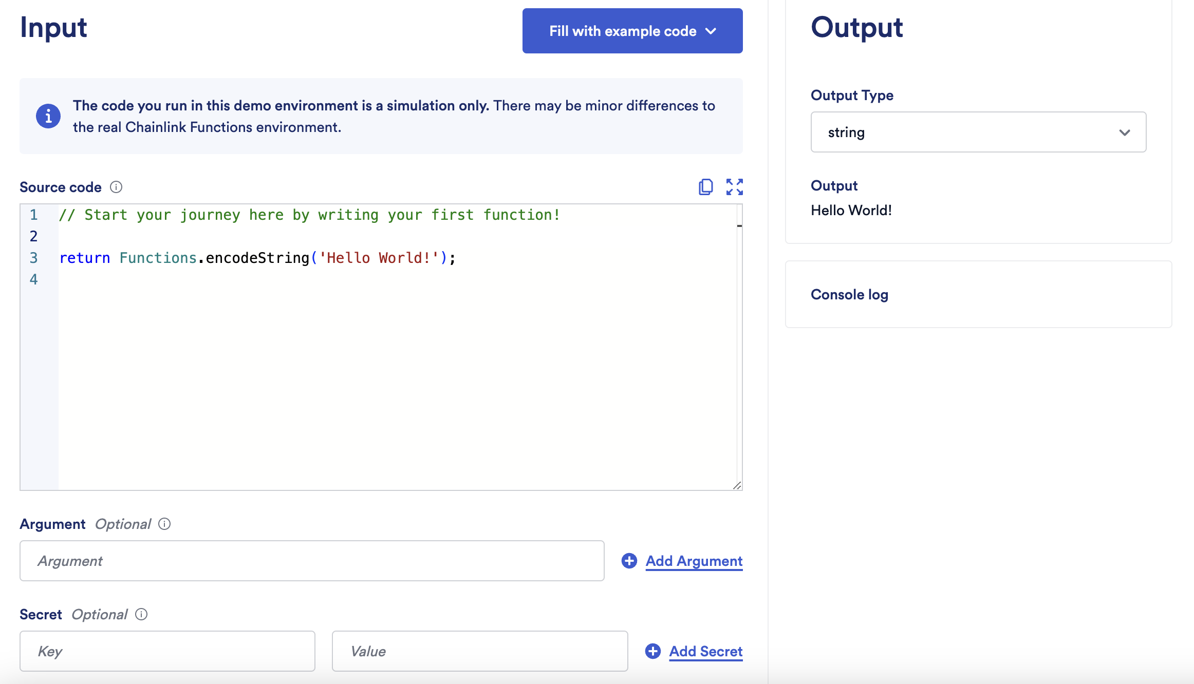 To use the Chainlink Functions Playground, enter any source code, arguments, and secrets you would like to use. Click the Run code button to view the output.